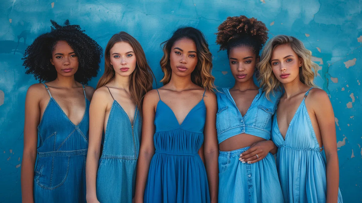 Diverse women in long denim dresses outdoors, emblematic of enduring style. Spring season.