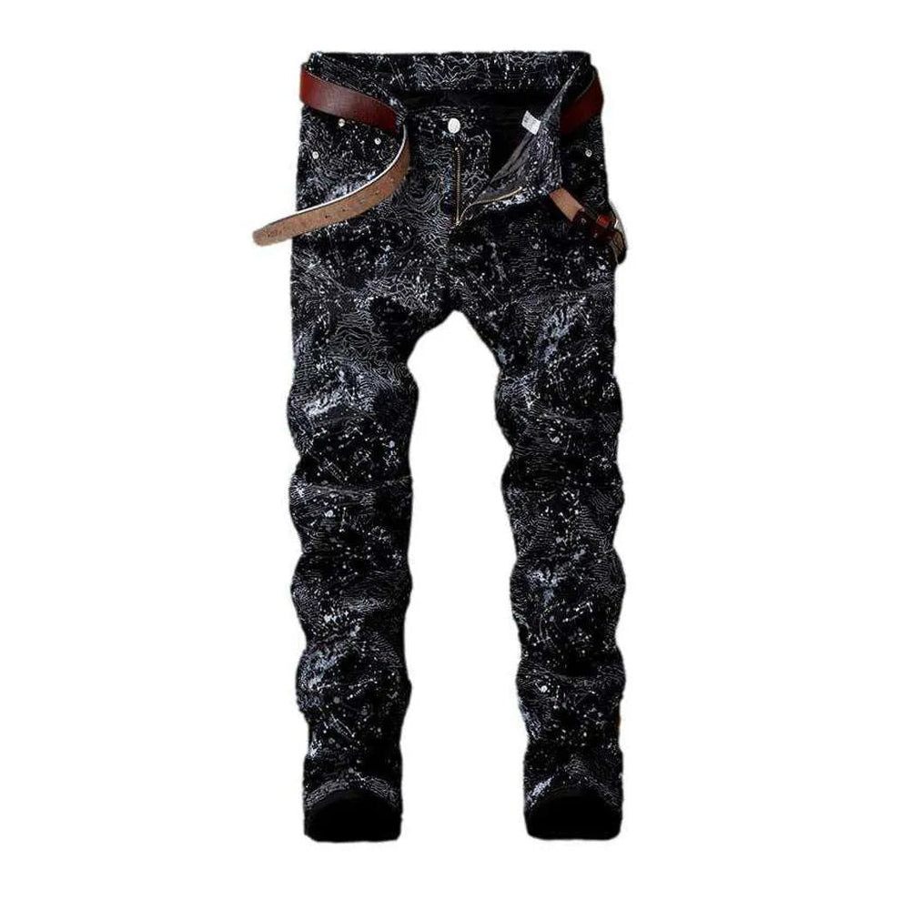 Ornament print black men's jeans